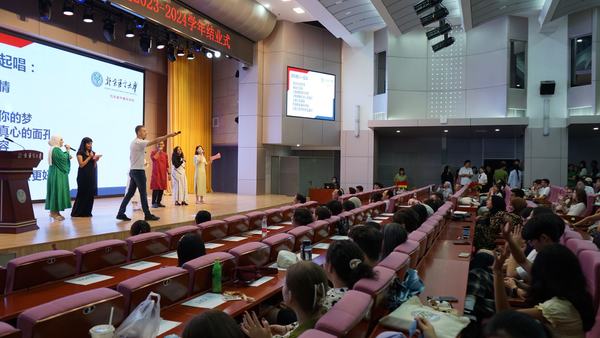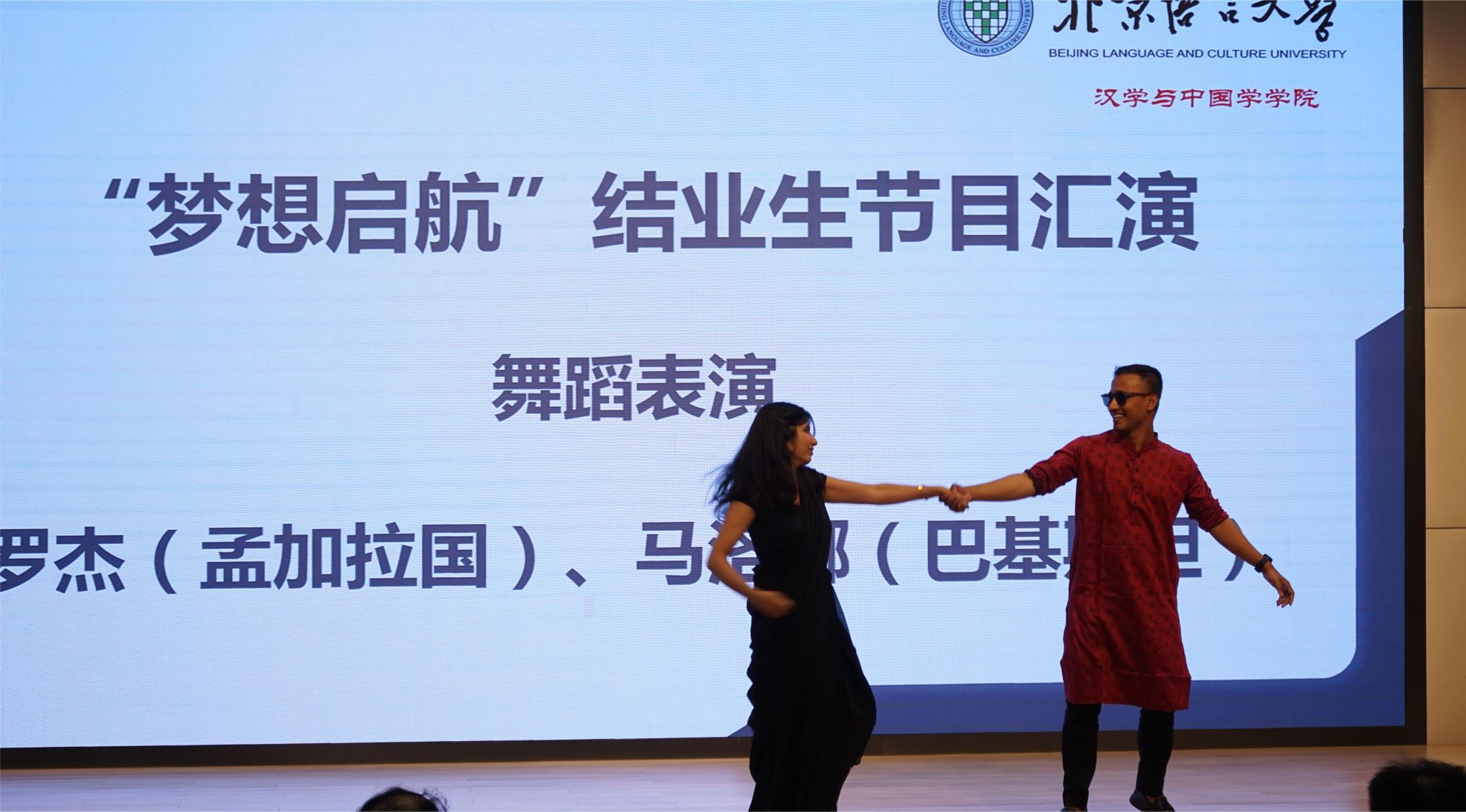 同学们为了表达对学院、对老师们的感谢,以“梦想起航”为题表演了文艺节目。各国同学以中文歌曲及舞蹈表达了感恩之心和不舍之情,动情之处,观众席上几百位同学自发加入合唱,共同唱响一曲青春之歌。