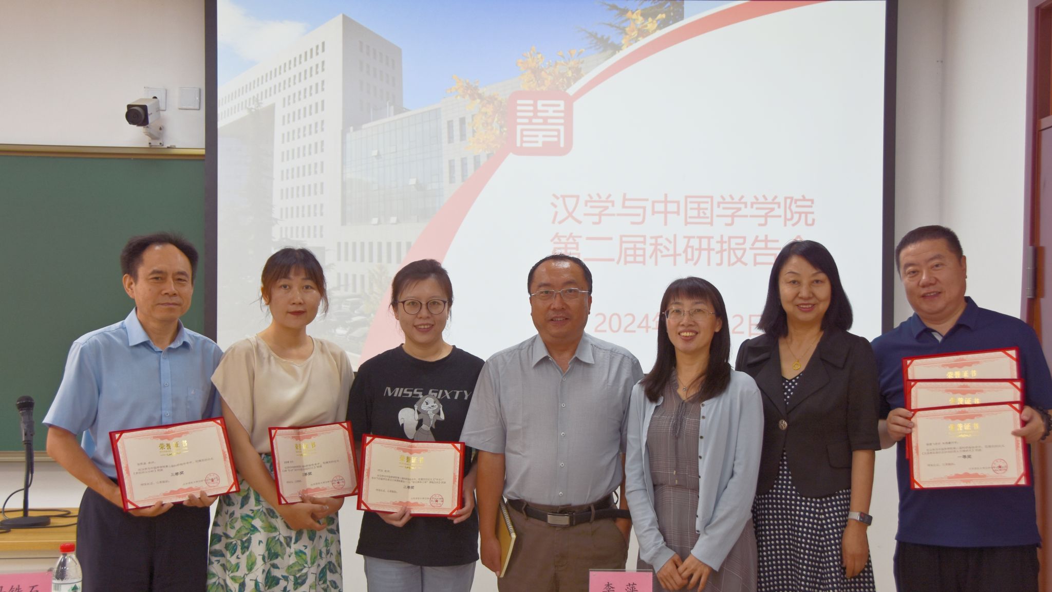 汉学与中国学学院第二届科研报告会在教二楼104教室成功举办。本届大会由汉学与中国学学院副院长牟世荣主持,学院党委书记马铁石、副院长(主持工作)李萍、副书记陈蕾出席会议并为论文获奖教师颁发荣誉证书。