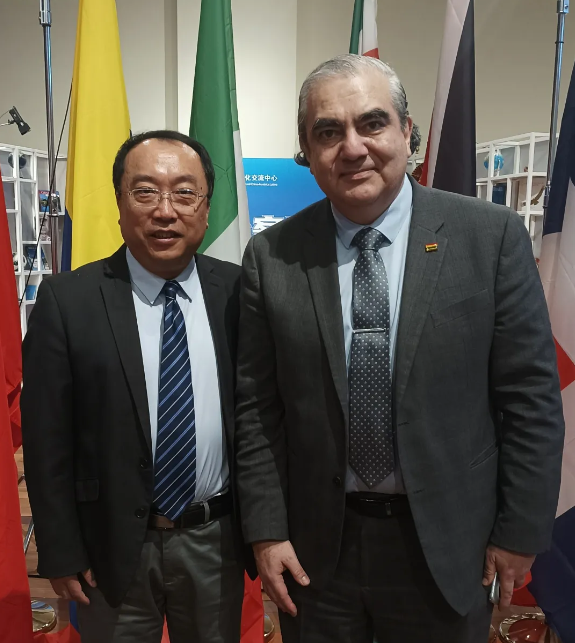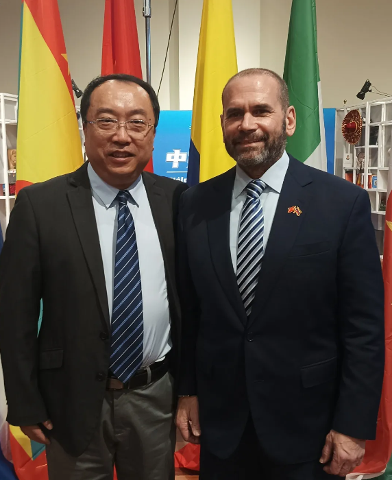 我校汉学与中国学学院党委书记马铁石与活动中偶遇的尼加拉瓜、阿根廷、委内瑞拉和玻利维亚等国驻华大使进行了友好交流。马铁石书记表示,非常欢迎拉美国家的学生到国产自拍