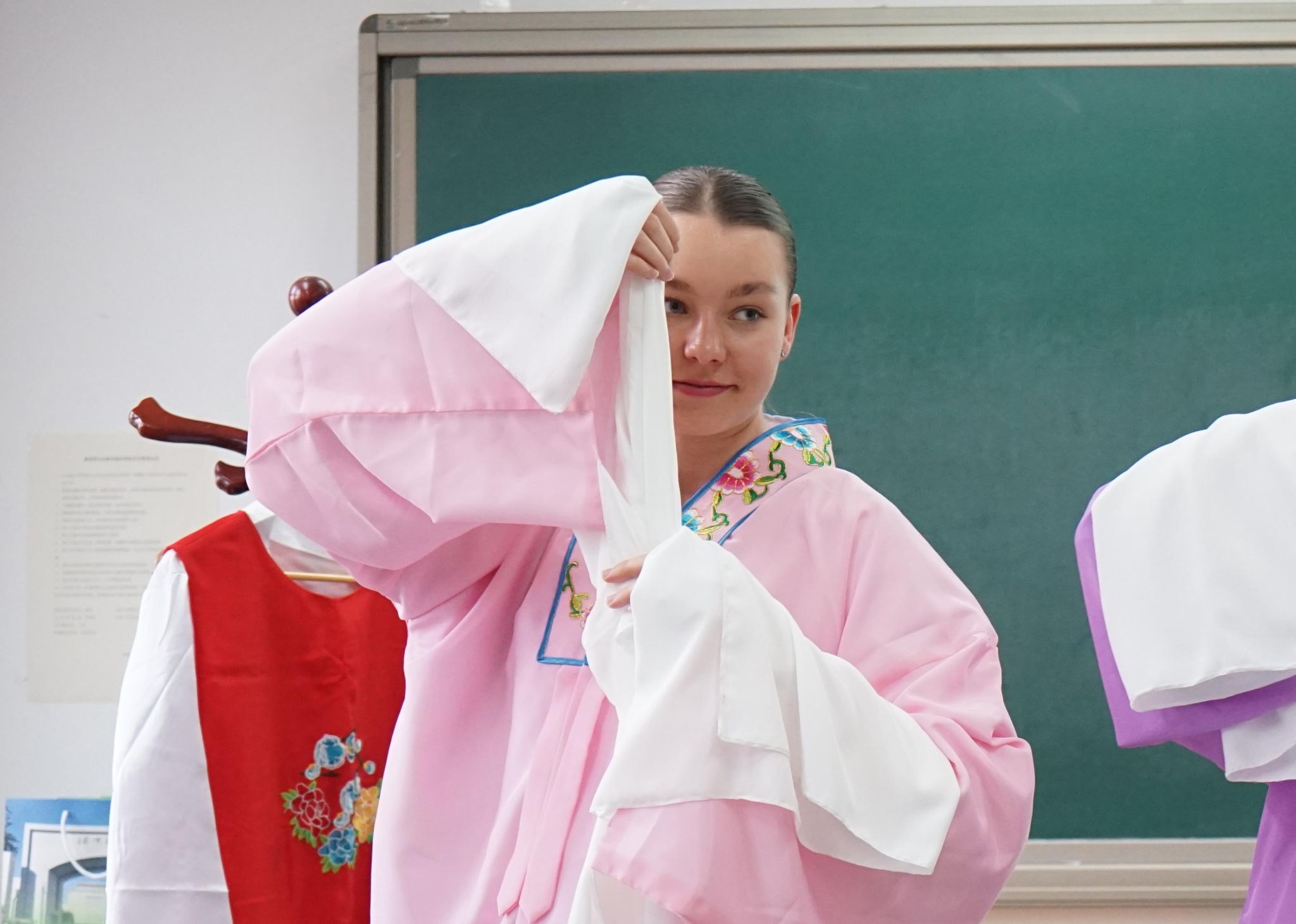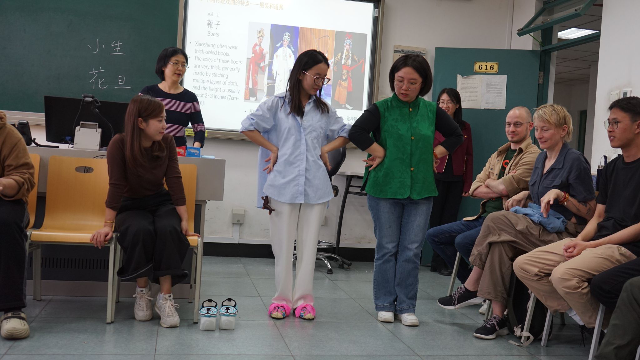 随后,老师们展示并介绍了戏曲的鞋子和服饰,并邀请同学们穿上靴子、戏服,亲身感受戏曲的韵味。
